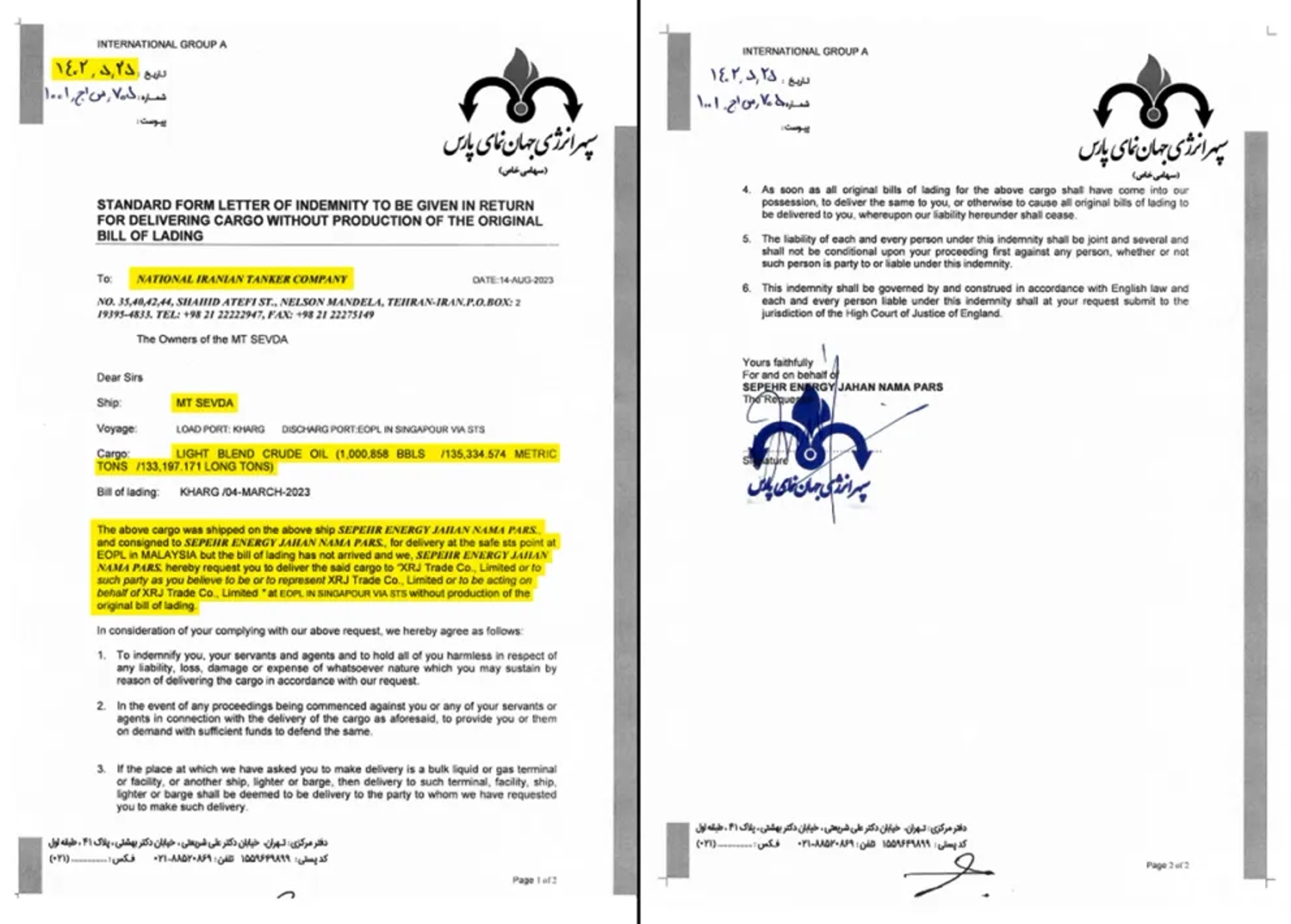 Another set of shipping documents shows the same military body guaranteeing Sepehr Energy Jahannama Pars’ obligations in chartering vessels from the National Iranian Tanker Company.