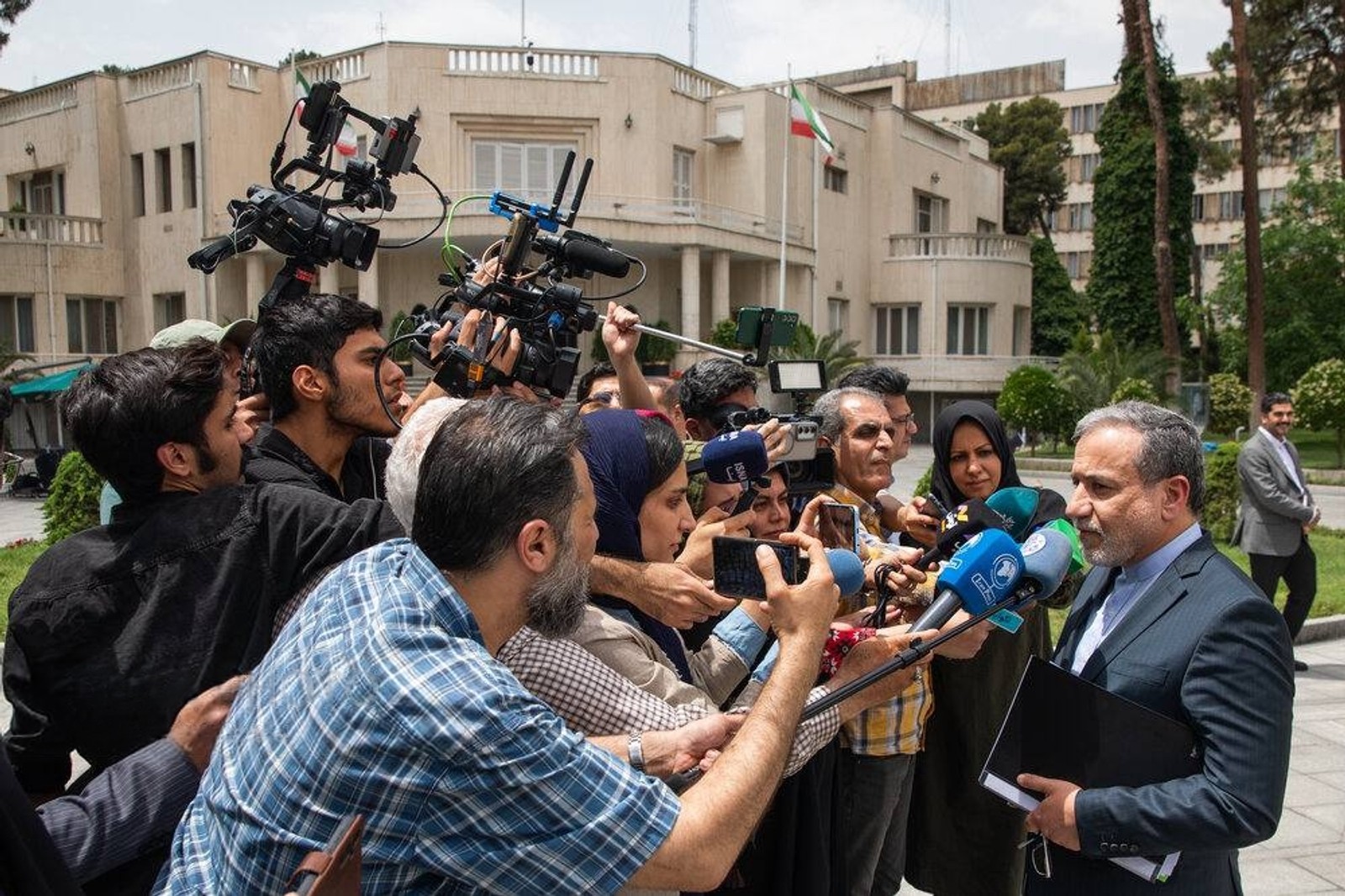 Iran's Foreign Minister Abbas Araghchi speaking to reporters in Tehran on May 14, 2025