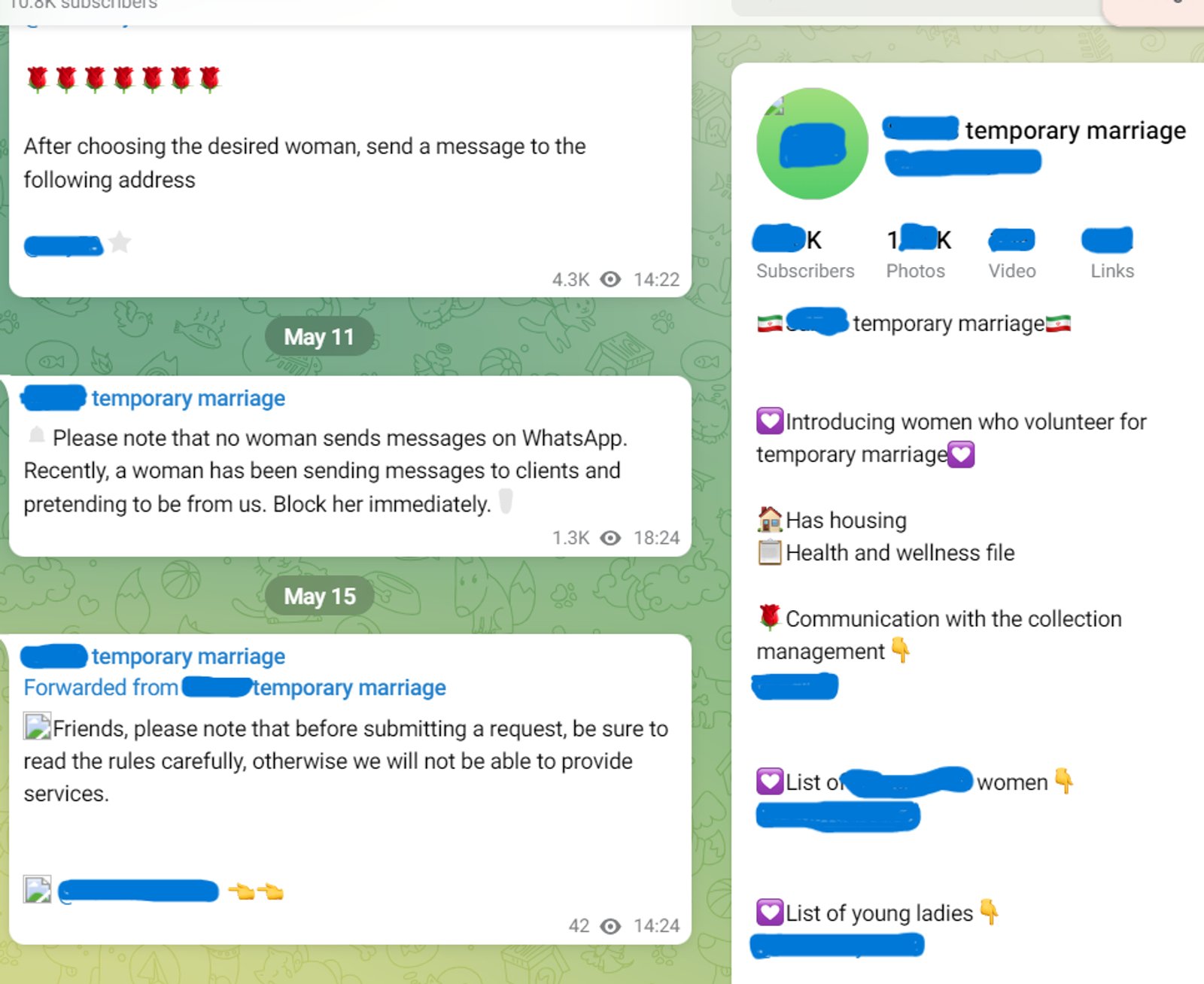 Listings often include physical traits, education level and place of residence. Some promise “virginity guaranteed.” Longer-term packages come with varying price tags—often higher for women labeled as educated or Tehran-based.